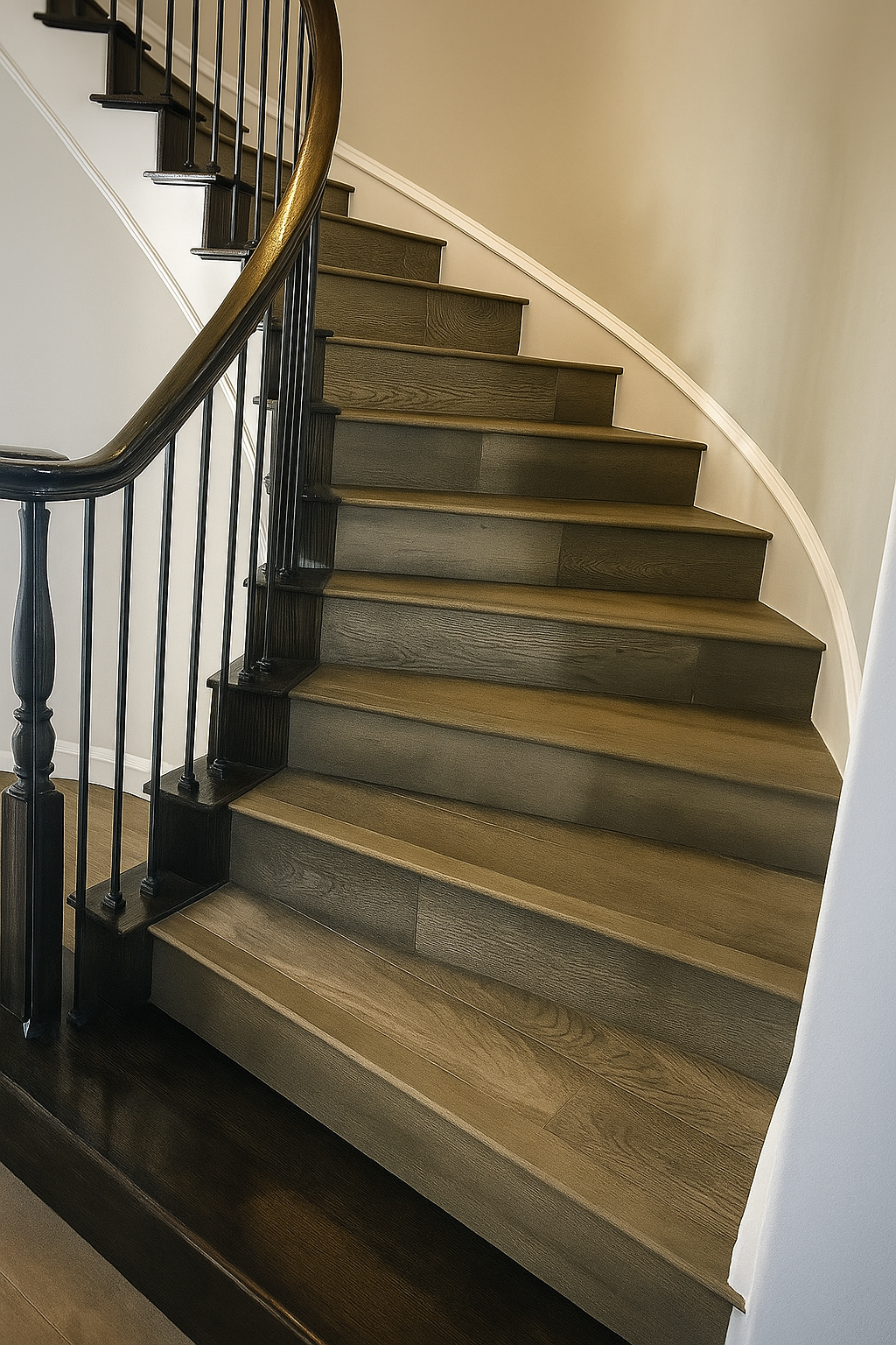 Custom stair refinishing and installations that match your floors seamlessly and elevate your home’s style.